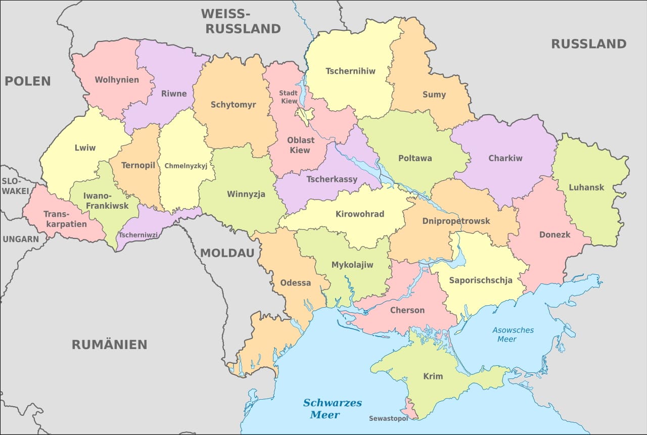 Ukraine with its first level divisions, the Oblasts (source).