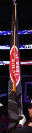 On https://www.instagram.com/saxyvocals/p/DHEThmAP20a/?img_index=1 is a black flag with a red seal. It is the flag of the Los Angeles Firemen's Relief Association.