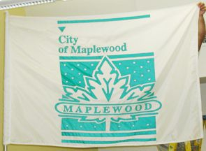 A white flag with the city emblem of a maple leaf on a blue-green background centered.