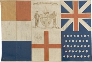 Caption: On the east side of Albany County, New York, resides the city of Albany, which is the both the county seat and capitol of New York state. The "Albany Bicentennial 1686-1886" flag measures 33"x23". This flag has 6 sections, with each section representing some historical theme relating to the city: [along the left hoist side] there are 2 long but thin vertical flags of The Netherlands: the Orange-White-Blue "Princevlag", which was used in The Netherlands from 1572 until the mid-1650s, & next to it is the national flag of The Netherlands: the Red-White-Blue that has been in use since the mid-17th century; [top middle] the city's coat-of-arms; [top right] the city under the rule of Great Britain is represented by its Union Flag {of 1006-1801} that was flown between 1664 - July 9, 1776 (when the New York state convention declared the state's independence from G.B. — although the U.S. Declaration of Independence was declared by the Continental Congress five days earlier on July 4, the attending New York delegation had abstained from voting at that time); [bottom right] the blue-canton of 38 stars/states in the U.S. flag in 1886; & [bottom middle] mistakenly represents the flag of "New England", which was widely reproduced as an erroneous flag. Fine details regarding this flag can be seen in an article at the "Zaricor Flag Collection" website: https://www.flagcollection.com/itemdetails.php?CollectionItem_ID=2392. The original copyright of this initially named "The Bi-Centennial Flag of Albany N.Y.” was filed by Franklin M. Danaher, in Albany city records: "Box 3, Folder 2", per https://www.albanyinstitute.org/tl_files/pdfs/library/Albany%20Bicentennial%20Commission%20Records,%201871-1922.pdf