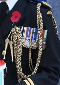 from the aiguillette (in gold and blue cord with tassels) worn from the left shoulder by such