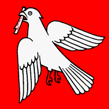 The heraldic term for wings, and sometimes (but not invariably) used to signify that those wings are extended in a horizontal position as if in flight – but see note below (also vol above, plus rising and displayed).